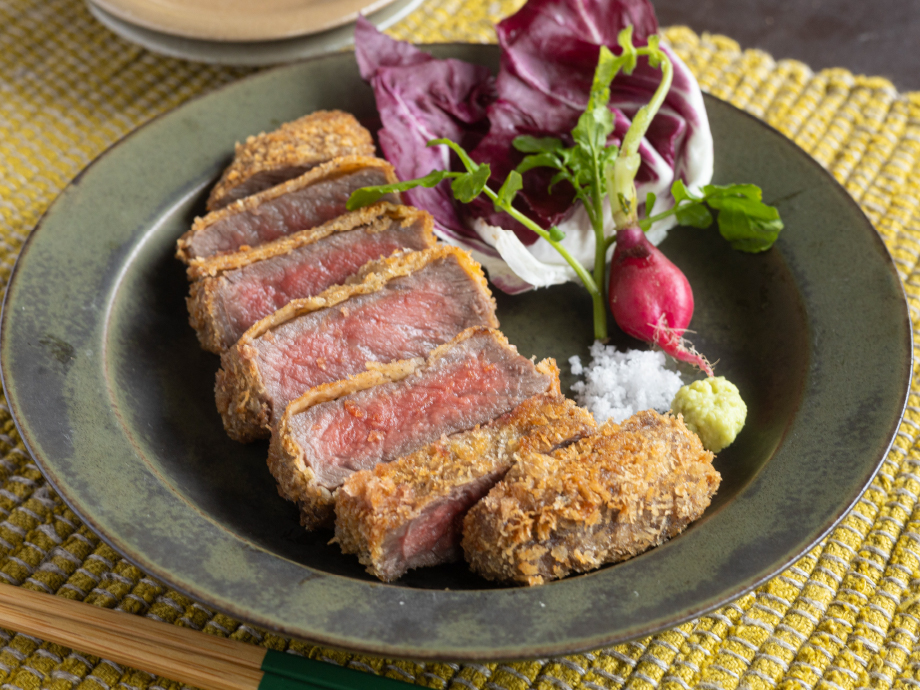 - 1牛肉は塩と粗びき黒こしょうを両面にふる。小麦粉、溶き卵、パン粉の順にまぶしつけ、ラップをかけて冷蔵庫で5分ほどおく