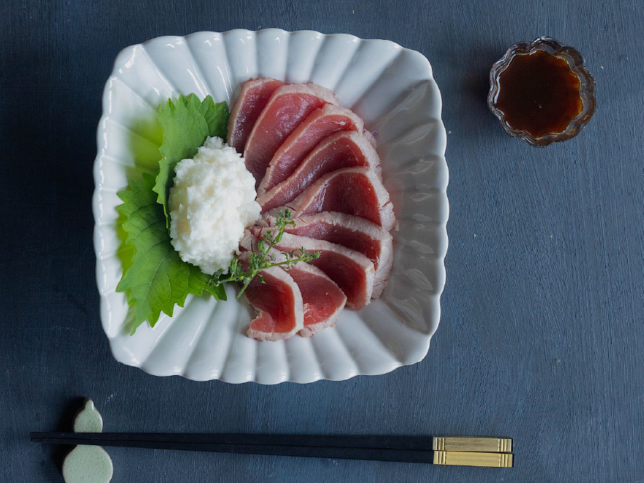 - 3[1]のマグロをスライスして器に盛り、[2]の長いもを添え、大葉と穂しそをあしらう。黄身じょうゆをかけていただく。