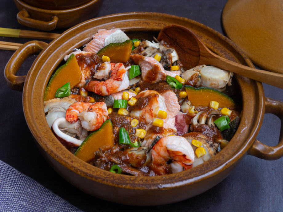 - 1生鮭は3~4等分に切る。いかはワタを取り除き、胴は1.5cm幅に切り、エンペラと足は食べやすい大きさに切る。えびは殻とワタを取り除く。キャベツは3cm角に切る。玉ねぎは1.5cm幅に切る。えのきは3等分の長さに切る。舞茸は小房に分ける。かぼちゃは1㎝の厚さにスライスする。ししとうは5ミリ幅の小口切りにする。合わせ味噌の材料を混ぜ合わせる。