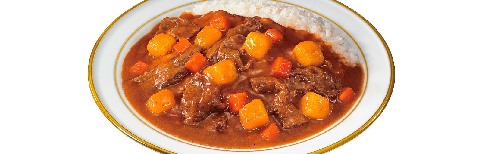 オリエンタル「マースカレー(中辛)」をベースに、こいくちソースを通常より10倍多く使用し、うま味の濃いカレーに仕上げました。マンゴー、りんご、レーズンなどの果物や野菜等を大釜で炊き上げた オリエンタル独自のマースチャツネを使用しています。