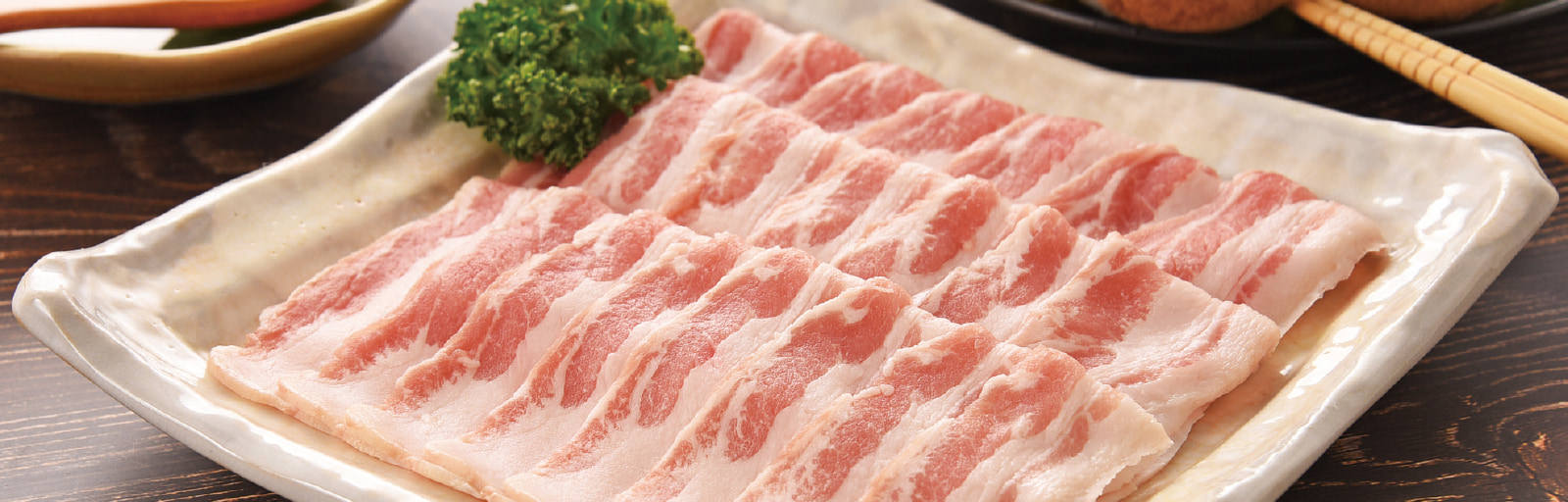 麦で育ったカナダ産の三元豚の豚バラ肉を”皮付き”でご提供します。特に豚バラ肉の皮の部分にはコラーゲンが豊富に含まれており、プルっとした食感も楽しめます。豚バラ肉をハーフカットにし、うすぎりにスライスしているので鍋物や炒め物など様々な料理にそのままご利用いただけます