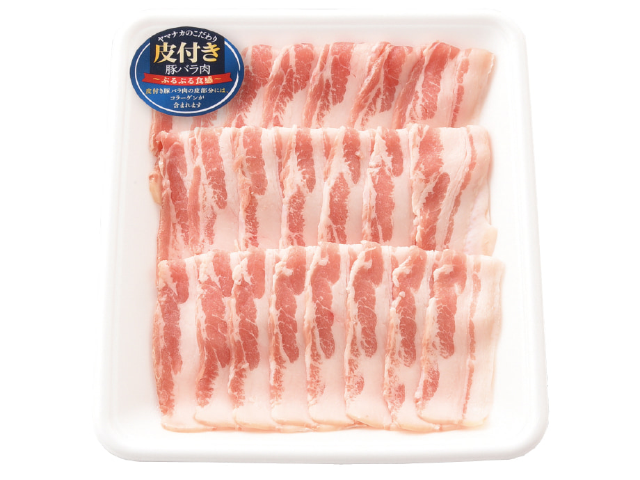 三元豚の豚バラ肉を”皮付き”でご奉仕!豚バラ肉の皮部分にはコラーゲンが豊富に含まれています。鍋物や炒め物に最適なお肉です。