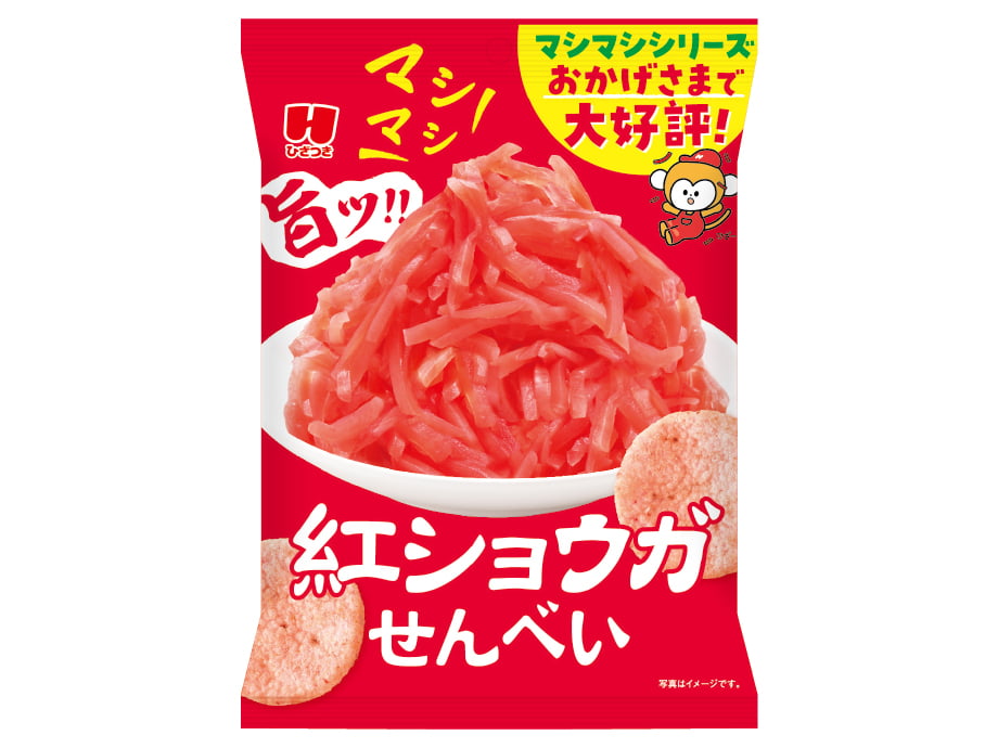 国産米100%の生地に紅ショウガチップを練り込み、さらに紅ショウガパウダーで上掛けをしたせんべいです。紅ショウガ好きには、たまらない濃厚な味わいです。