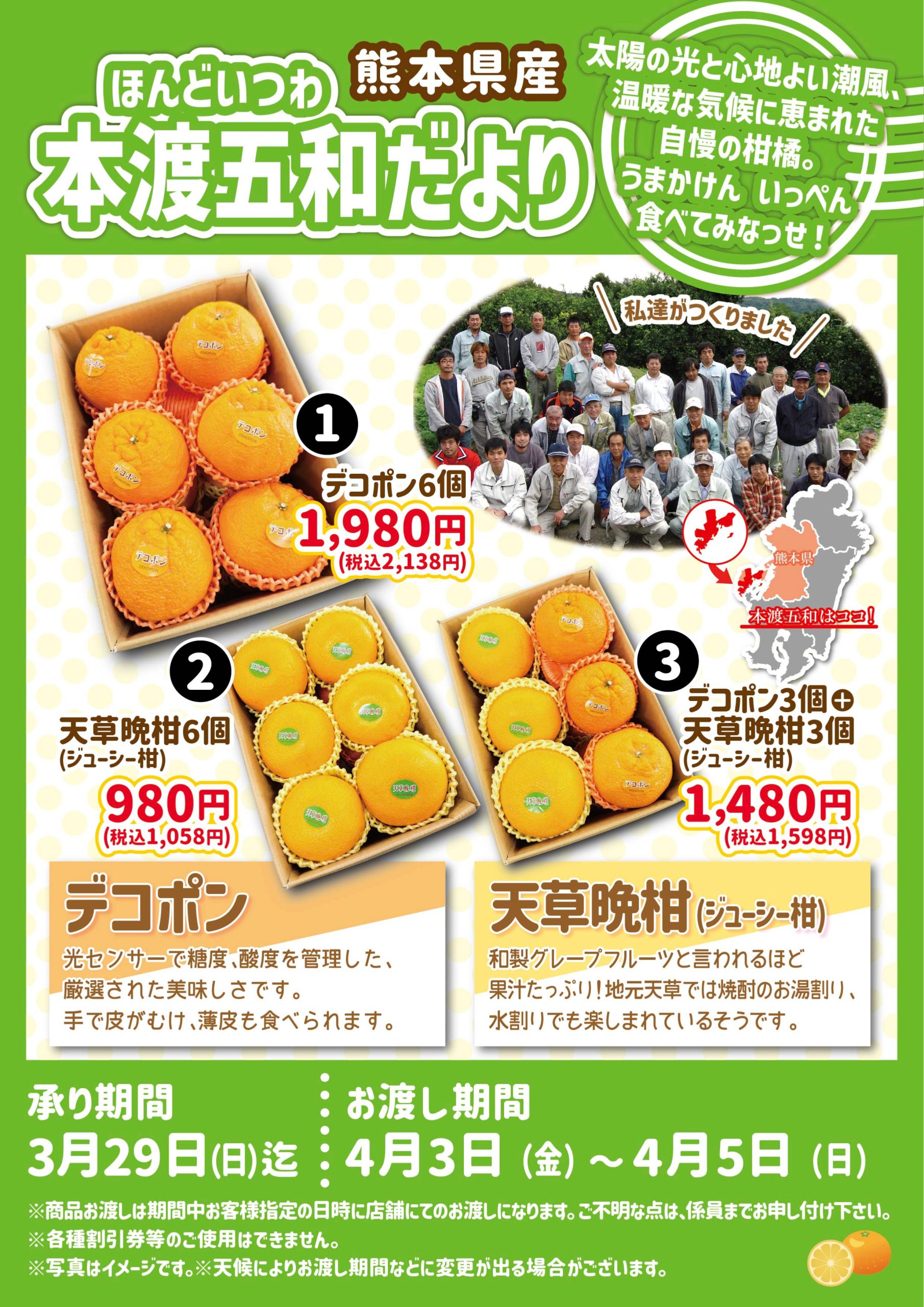 季節のお野菜・果物ご予約承り中♪ 2026年2月12日 【熊本県産 本渡五和だより】 承り期間:3月29日(日)までお渡し日:4月3日(金)~5日(日)※詳しくはパンフレットをご確認下さい。 お知らせ一覧へ