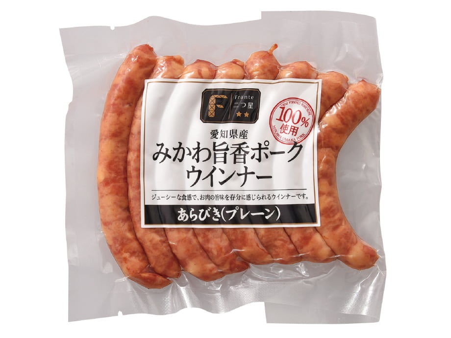 愛知県産の豚肉「みかわ旨香ポーク」を100%使用して作ったあらびきソーセージです。岩塩で味を引き締めており、豚肉の旨味を強く感じられます。味がはっきりとしたウインナーですのでおかずのメインとしてもお料理の具材としてもオススメです。