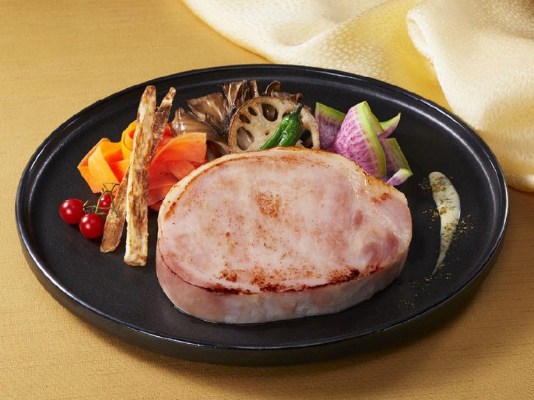 夕食のメインにもなる厚み約16㎜の贅沢な厚切りハムステーキです。 -