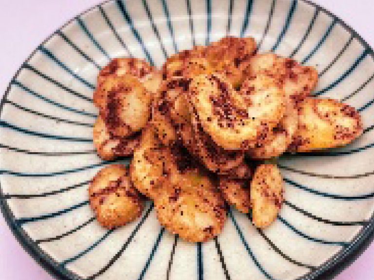 芳香な赤味噌パウダーを香ばしく揚げたそら豆にまぶしました。 -