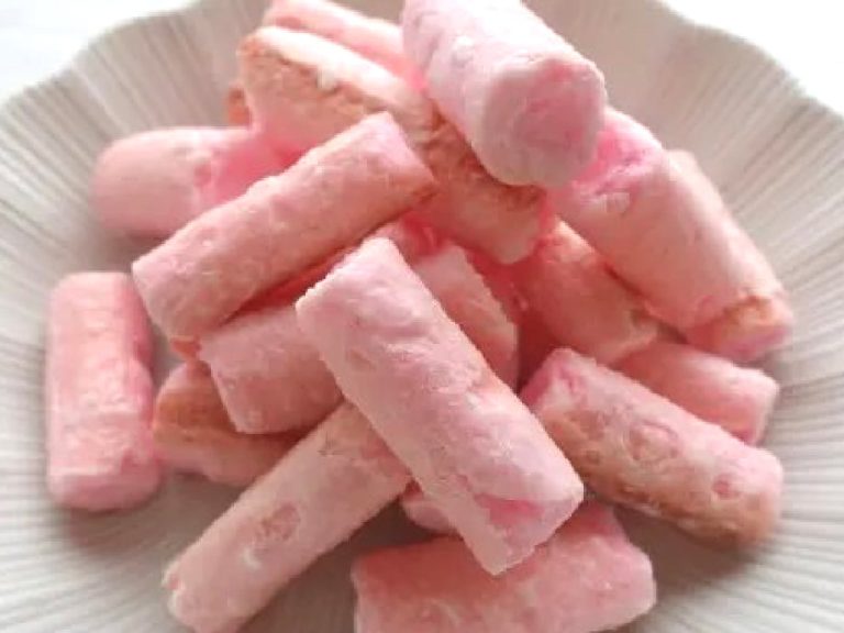 ほんのり甘くてサクサクおいしい春色ふ菓子。食べやすいひとくちサイズでアイスのトッピングにもおすすめ。 -